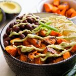 Healthy can be tasty! Dig into this quinoa bowl packed with pan seared sweet potatoes, hearty black beans perfectly paired with a cool avocado cream sauce.