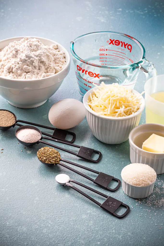 - Add all ingredients except butter and garlic salt to bowl of a stand mixer in the order listed. When you're adding the flour, be sure to stir it first, then scoop into a measuring cup and level off with the flat side of a knife. This method is important, because it ensures you aren't getting too much flour in the dough. Too much flour = dense and gritty rolls and we don't want that!